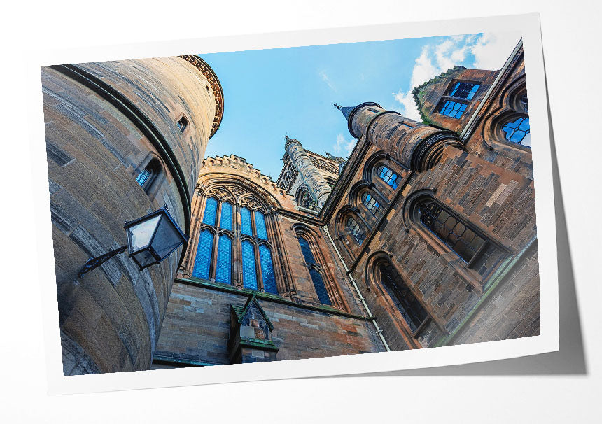 Unframed, unmounted colour photo print featuring the University of Glasgow’s west quadrangle and tower.